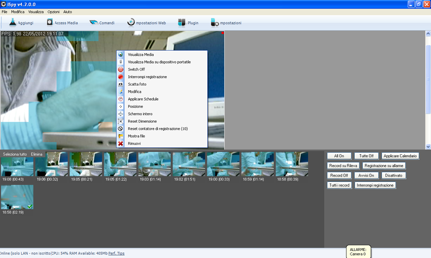 Una volta connessa la webcam è possibile impostare la sensbilità con cui attivare gli allarmi se vengono rilevati movimenti nel video, decidere se registrare i filmati(supporta i formati H264. Mpeg4 e Avi) ed eventualmente caricarli sul proprio account youtube oppure copiare su un server ftp le schermate del video.