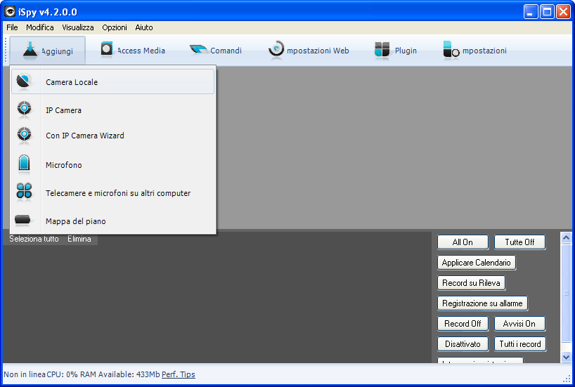 Installato ed avviato il programma potete collegare la Webcam connessa al Pc con il pulsante Aggiungi->Camera Locale, se disponete invece di una IP Webcam utilizzate il pulsante IP Camera o il relativo wizard mentre il pulsante Microfono permette di monitorare una fonte audio.