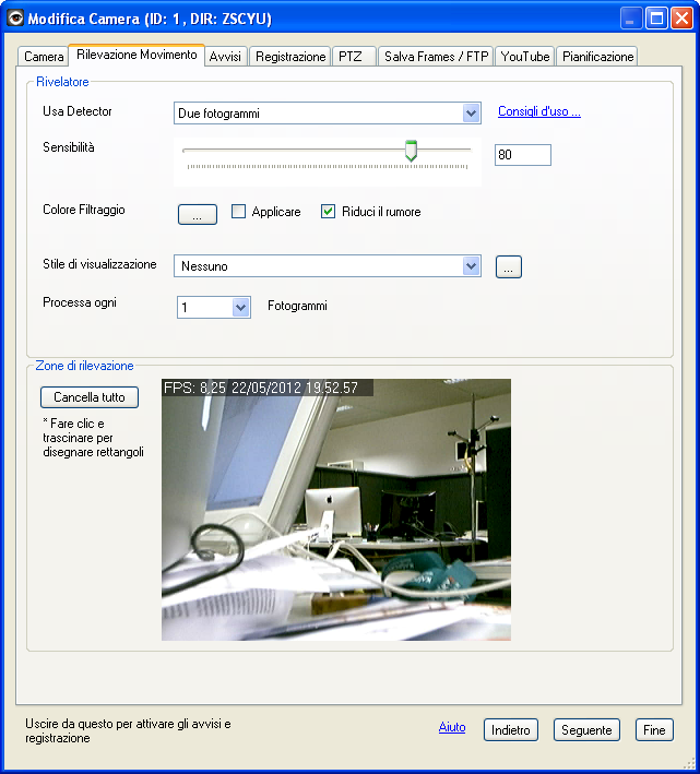 Se il modello della webcam collegata consente il controllo di movimento e zoom (le funzioni pan-tilt-zoom PTZ) ed è tra quelle supportata dal software possiamo configurarla per il controllo da remoto. È anche possibile pianificare l’accensione e lo spegnimento della camera nei giorni e negli orari desiderati.