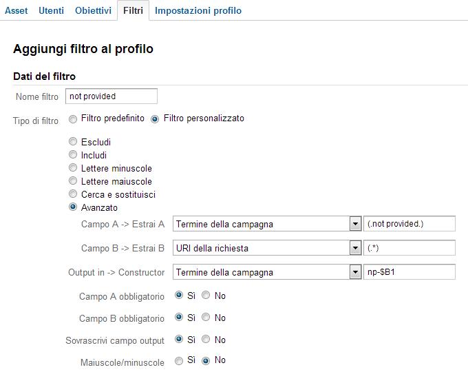 NB: Una volta creato questo filtro, solamente le nuove visite verranno tracciate con questa nuova terminologia. Tutte le vecchie visite rimarranno memorizzate nella parola chiave (not provided).