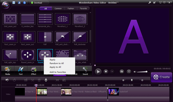 Per inserire un effetto di transizione clicca sulla scheda “Transition” e poi scegli l’effetto che più ti piace. Una volta trovato potrai applivarlo a tutti i video oppure solo ad una coppia di file video.