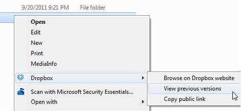 Se si utilizza Dropbox su Windows basta fare click col tasto destro del mouse sul file e andare su “Dropbox – > Visualizza le versioni precedenti”. Si aprirà l’interfaccia web di Dropbox che mostrerà tutte le versioni dei files che è possibile ripristinare.