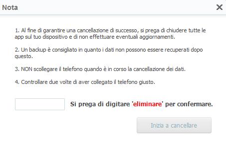 Per confermare scrivi la parola “eliminare” nel box e clicca poi sul pulsante “Inizia a cancellare”. Ora inizierà il processo di rimozione dati (apps, messaggi, contatti, foto, impostazioni personali, ecc…). Non scollegare il dispositivo dal computer fino alla fine!!